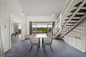 The thoughtfully planned layout features open, light-filled spaces that blend modern style with everyday functionality. The contemporary kitchen includes a walk-in scullery and dishwasher, while a heat pump system provides efficient year-round climate control. Multiple living areas offer flexibility for relaxation and entertaining, with seamless flow to outdoor spaces including a deck, perfect for gatherings or quiet evenings.
